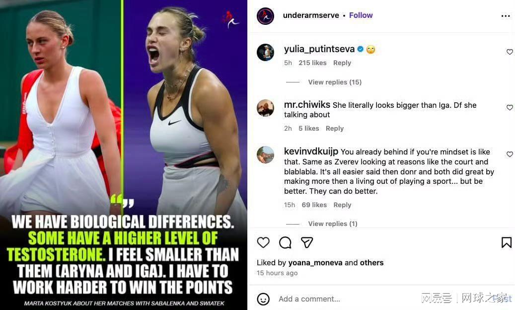 这场决赛前,科斯秋克经历了一段不平静的时期。去年十月底,她在一场访谈中谈及萨巴伦卡与斯瓦泰克时,被媒体断章取义地报道为“用睾固酮水平较高来解释她们的身体差异”,引发了不小的争议。